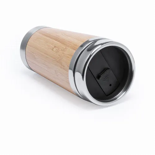 Tabletop glass with stainless steel interior and bamboo wood exterior.