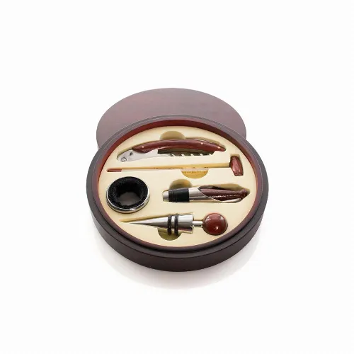 Wine set of elegant circular design with natural wood finish.
