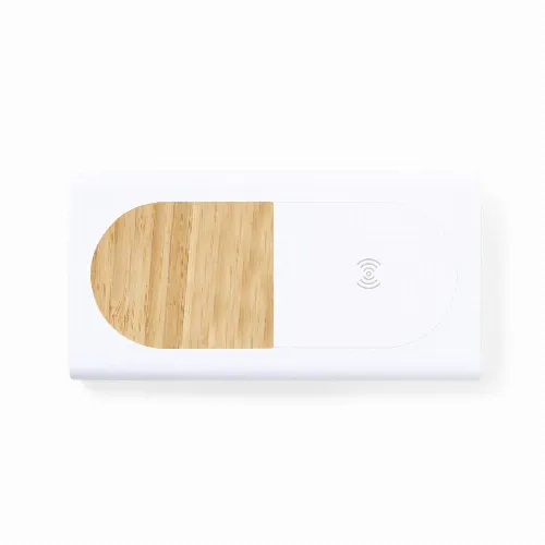 Nature line, external auxiliary battery with integrated wireless charger and 15W quick charge function.