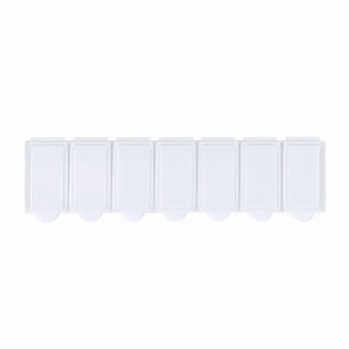 Weekly pill organizer made of durable solid white PP material.