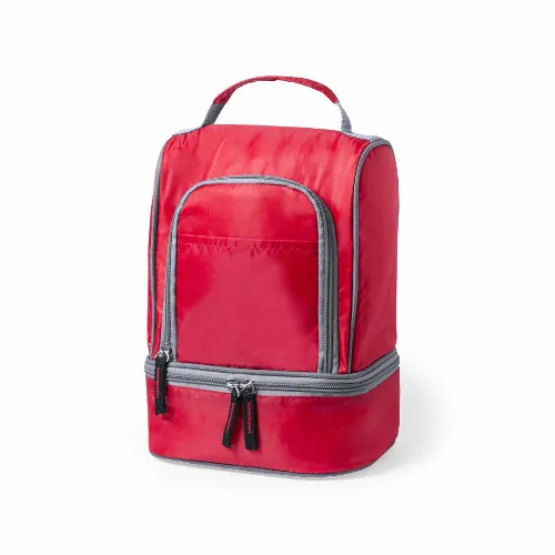 Multi purpose cooler bag in 210D polyester in bright tones and with two independent compartments with zipper closure.