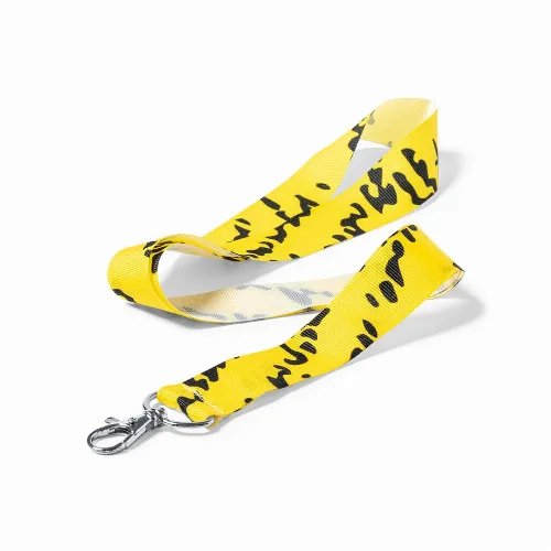 Lanyard with special wide strips in resistant and soft polyester with metallic carabiner accessory.