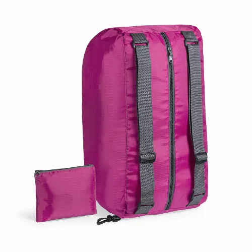 Folding backpack bag in soft and resistant ripstop material in bright tones, with zipper closure and accessories in grey and black.