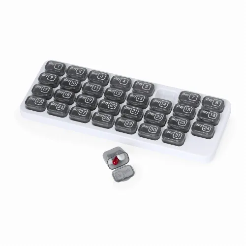 Original pastillero mensual fabricado en PP resistente, con 31 casillas independientes y extraíbles para guardar todas las pastillas necesarias para el día.