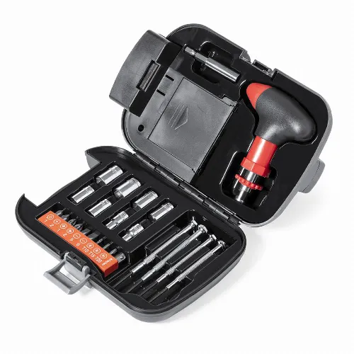 Tool set of 24 accessories in resistant case with built-in LED flashlight.