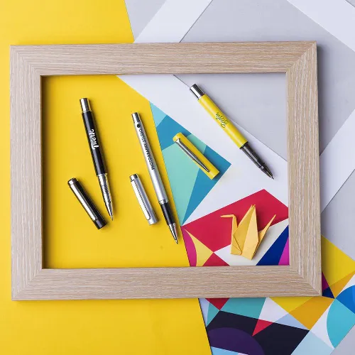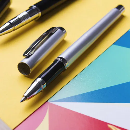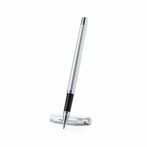 Stylish, bicolor design hood roller with body in aluminum material. Chromed details and metal clip. Jumbo refill and blue ink.