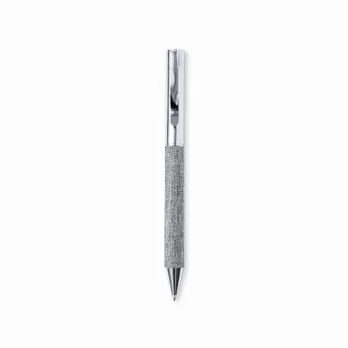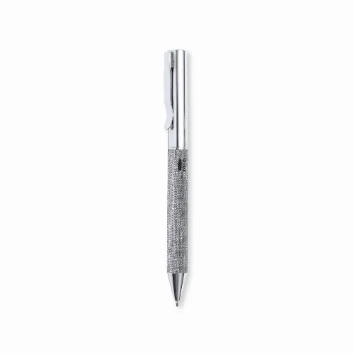 Ball pen made in chrome-plated metal, with RPET polyester coated barrel, made from recycled plastic to encourage the reuse of plastic waste and help the sustainability of the planet.