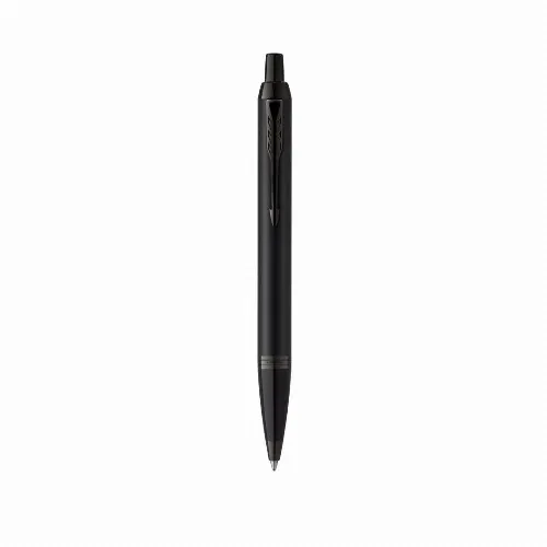 Parker ball pen IM Achromatic, made in stainless steel with matte black lacquer finish, push-button mechanism and blue ink.