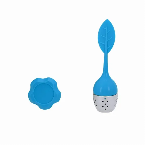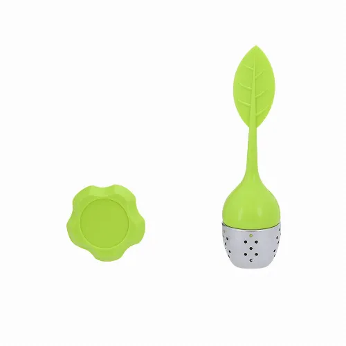 Tea infuser with leaf design, made of silicone and stainless steel.